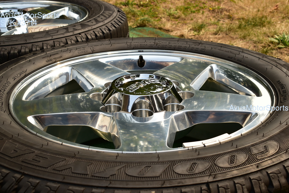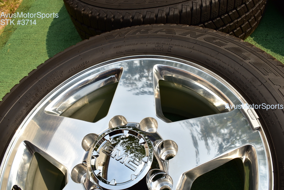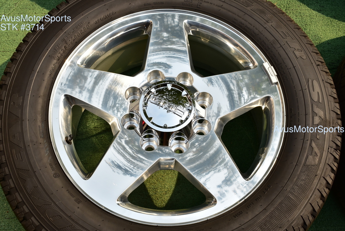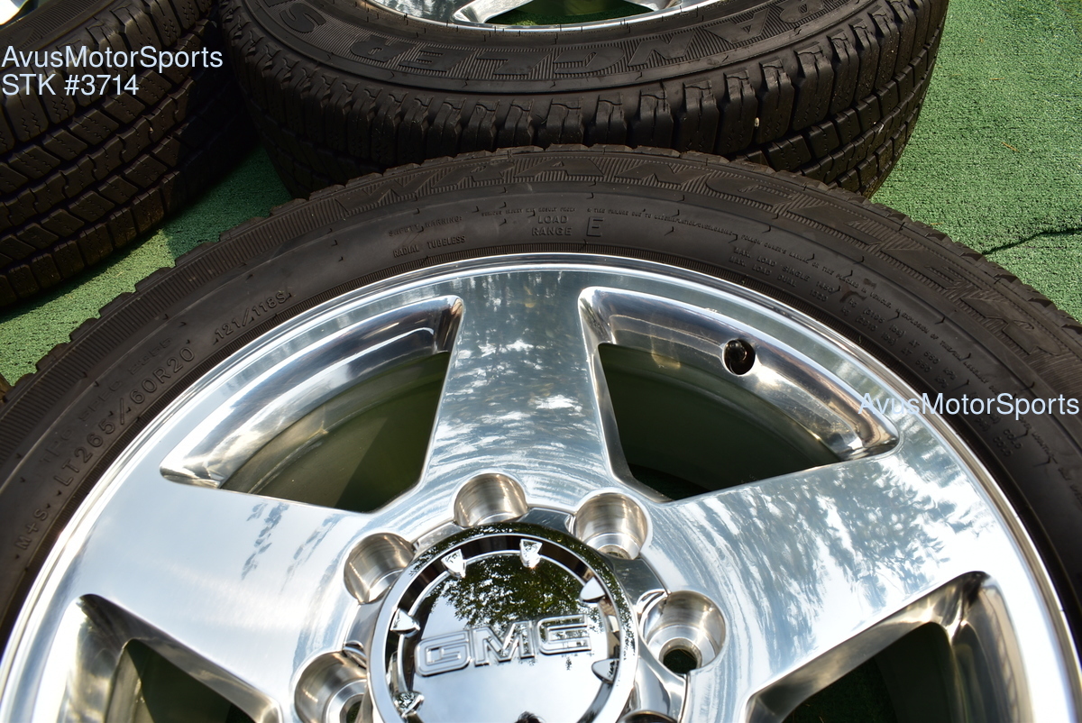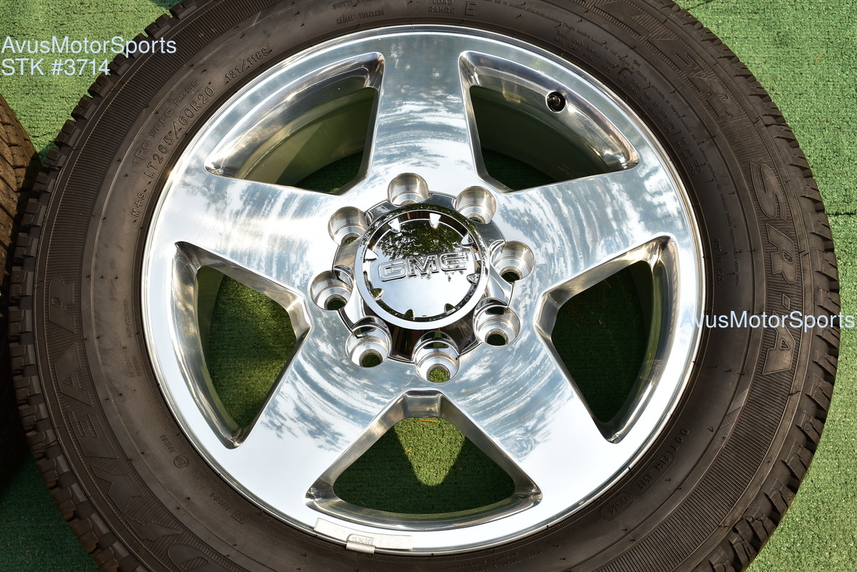 This listing is for a set of (4) 2014 GMC Sierra HD 2500 20" OEM genuine factory wheels NOT REPLICA with Goodyear LT265/60R20 tires.