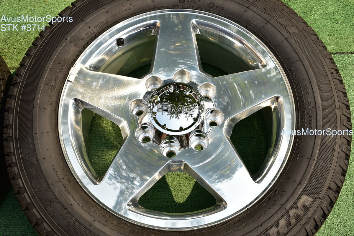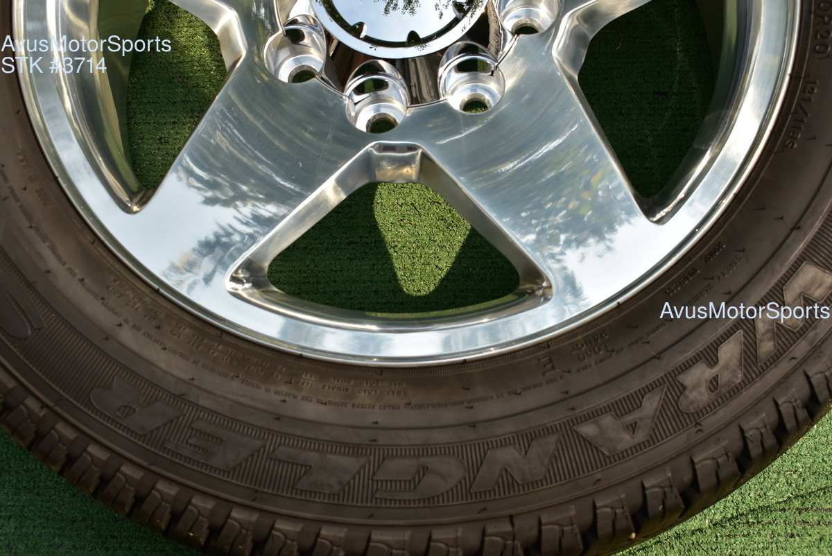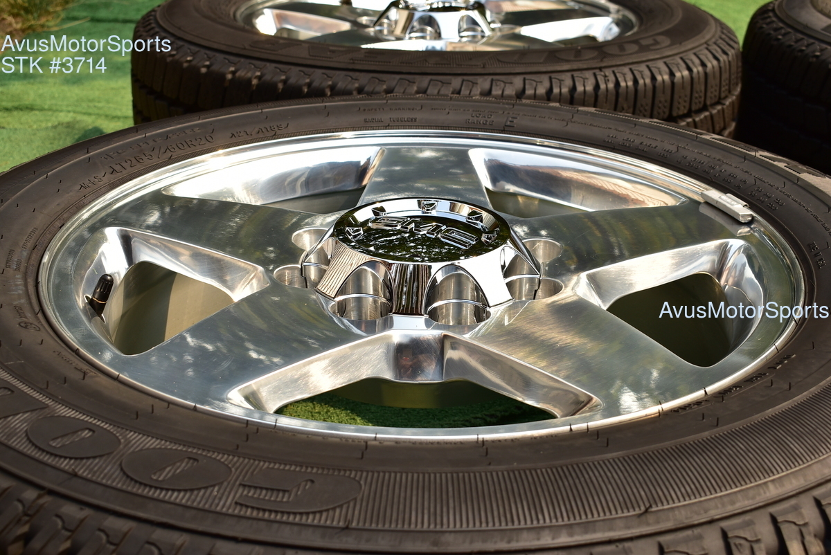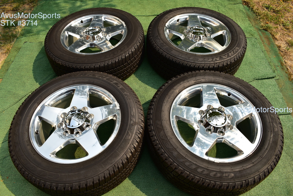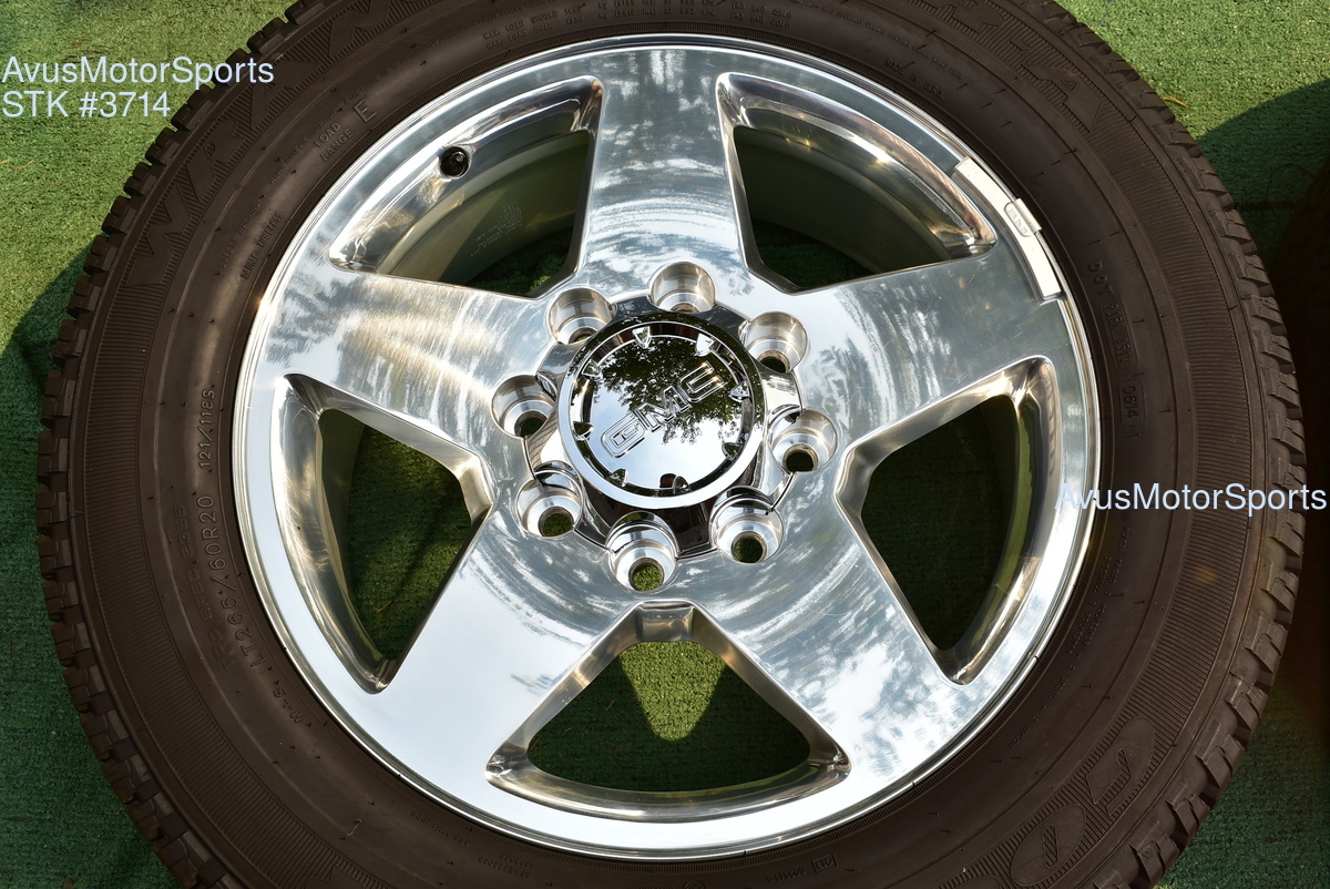 This listing is for a set of (4) 2014 GMC Sierra HD 2500 20" OEM genuine factory wheels NOT REPLICA with Goodyear LT265/60R20 tires.